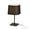 Asztali lámpa négyzet alakú textil búrával és fém talppal.