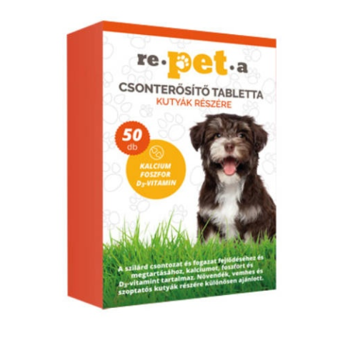A Repeta Csonterősítő tabletta kutyák részére táplálkozás-élettani adatok alapján összeállított, ízesített kiegészítő állateledel, amely megfelelő arányban és mennyiségben, jól értékesülő formában tartalmaz kalciumot, foszfort és D3-vitamint.