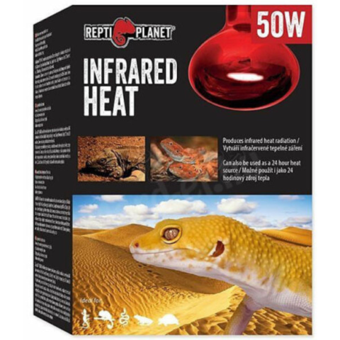 Repti Planet Infrared Heat 50 wattos melegítő izzó infravörös hősugárzással. Repti Planet 50 wattos infravörös melegítőlámpa, melynek vörös fénye nem zavarja meg az állatok nappali-éjjeli ciklusát. Növeli a terrárium belső hőmérsékletét. Alkalmazható 2