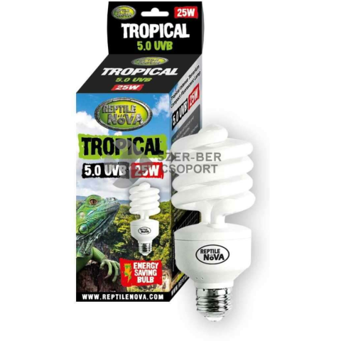 Reptile Nova Tropical UVB 5.0 energiatakarékos terrárium izzó. Spirális kompakt izzó E27 foglalatba, stabil hullámú UVB sugárzással. Az UVB sugárzás serkenti a D3 vitamin termelődést és a kalcium felszívódást, így a terráriumi hüllők csontozata egészségesen fejlődhet, és az anyagcsere betegségek is megelőzhetők. Emellett UVA sugárzást is biztosít, ami serkenti az étvágyat, a természetes viselkedést, és a szaporodási kedvet. Fénye az 5%-os UVB sugárzással a