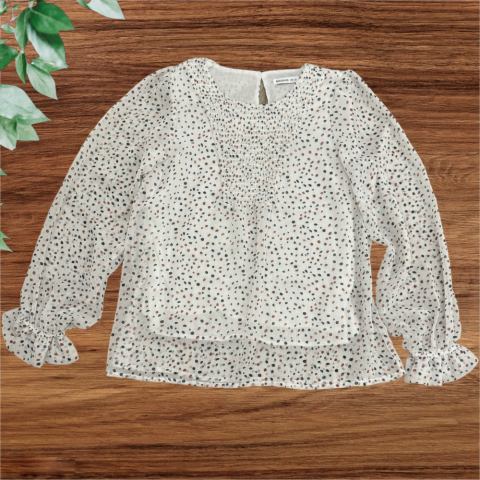 Csinos pöttyös blúz Egyenes szabású, kerek nyakú, dupla anyag, nyaknál egy gombbal záródik, ujja vége fodros. Hibátlan állapotú.