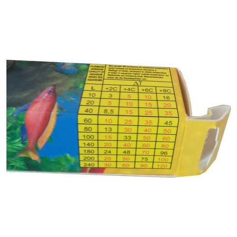 Hőfokszabályzó nélküli akvárium fűtő. Folyamatos hőleadás, a hőemelkedés a vízűrtartalom, és a fűtőteljesítmény arányától függ - lásd a csatolt képet és az azon lévő táblázatot.