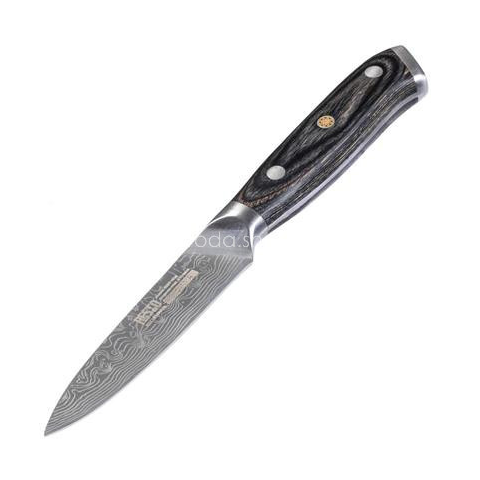Hámozókés, 10 cm, RESTO Ogma 95344 Minden késünk kézzel készül speciálisan edzett acélból. -antibakteriális felület -lézergravírozott, damaszkuszi acélra stilizált penge -ergonomikus fogantyú -könnyen tisztítható -stílusos kialakítás -anyaga: rozsdame