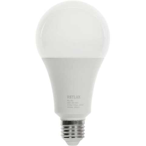 LED izzó - E27 foglalat, D energiaosztály, 20 W energiafelhasználás, 230 V feszültség, 2700 lm fényáram, meleg fényű (3000 K), 80 Ra színvisszaadási index (CRI), 416,67 óra élettartam A praktikus Retlux LED izzó alacsony energiafogyasztást és hosszú élettartamot kínál, ami 416,67 óra. Minimális hőenergiát termel a hagyományos izzókhoz képest, ráadásul azonnal és villogás nélkül műk