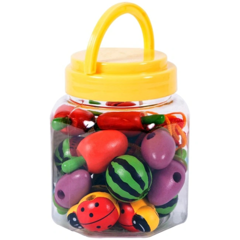 Retoys Fűzhető fa gyümölcs készlet Ajánlott 3-6 éves korig lányoknak [Cikkszám 23284]A Retoys gyöngyfűző készlete remek választás mindazok számára, akik szeretnék színesebbé tenni a konyhájukat. Ez a fűzhető fa gyümölcsök és zöldségek készlete egy praktikus befőttes dobozban érkezik, tele ízletes gyümölcsöt és zöldséget formázó elemekkel. A fából készült növények közepén található lyukak lehetővé teszik, hogy egyszerűen átfűzhesd rajtuk a