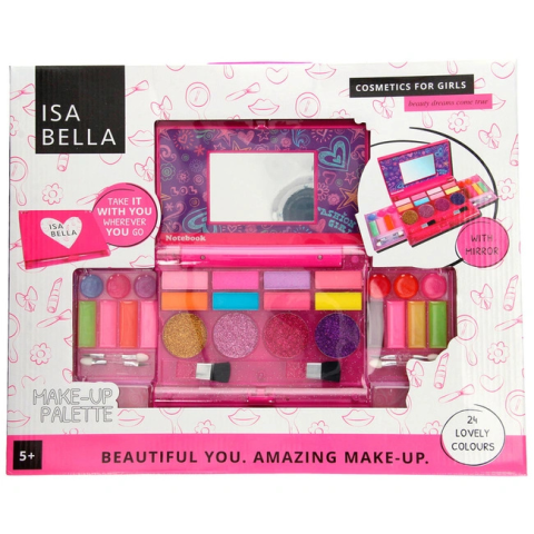 Retoys Isabella smink szett Ajánlott 3-6 éves korig lányoknak [Cikkszám 45456]A Retoys gyerek smink és körömlakk kategóriájába tartozó Isabella smink készlet igazi álom minden kislány számára, aki szereti a szépítkezést. Ez a készlet 24 színből álló sminkpalettával rendelkezik, amely lehetővé teszi a különféle színek kipróbálását, beleértve a rózsaszínt, lilát, kéket és narancsot. A színes szemhéjpúderek és szájfények nemcsak szórakoztatóak, hane