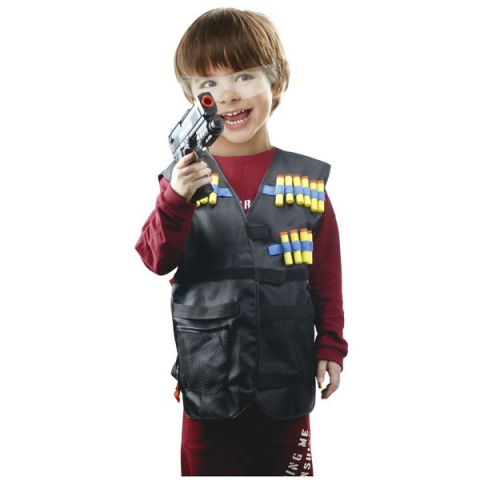 A készlet a mellényt, a védőszemüveget, pisztolyt és szivacslövedékeket is tartalmazza.