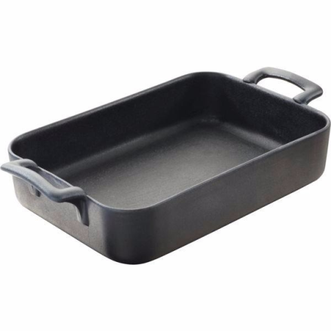 A Revol fekete porcelán sütőtál öntöttvas hatású kivitelben, 20 x 10,5 cm-es méretben ideális a tálaláshoz. A szögletes kerámia tál sütőbe, mikrohullámú sütőbe és fagyasztóba is alkalmas, és mosogatógépben mosható.