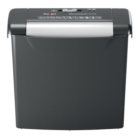 Iratmegsemmisítő, csík, 6 lap, REXEL, Momentum S206 Automata iratmegsemmisítő otthoni irodába, 1 felhasználó számára. - biztonsági szint: DIN-P2 - vágás típusa: papír-csík (6 mm) - adagolás: 6 lap/80 g-os papír (7 lap/70 g) - papíradagoló szélesség
