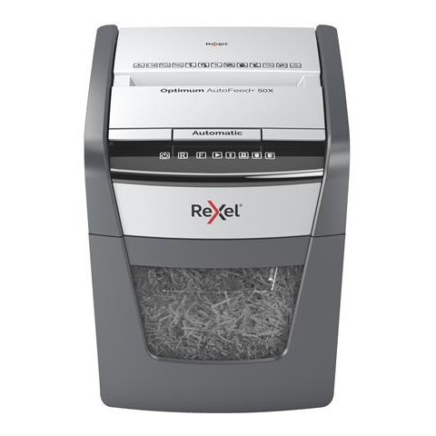 Iratmegsemmisítő, konfetti, 50 lap, REXEL, Optimum AutoFeed+ 50X Nincs szükség a lapok kézi adagolására, a tűző- vagy gemkapcsok eltávolítására, a REXEL Optimum Autofeed+ iratmegsemmisítő elvégzi Ön helyett a munkát! -egyszerre akár 50 lap (A4, 80 g/m