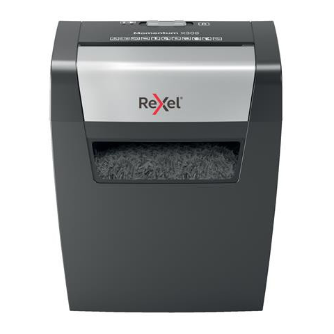 Iratmegsemmisítő, konfetti, 8 lap, REXEL, Momentum X308 Automata iratmegsemmisítő otthoni irodába, 1 felhasználó számára. - biztonsági szint: DIN-P3 - vágás típusa: papír-konfetti (5x42 mm) - adagolás: 8 lap/80 g-os papír (9 lap/70 g) - papíradag