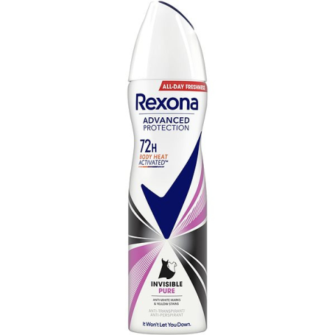 Izzadásgátló - női, spray, zsíros, normál, kombinált és száraz bőrre ajánlott, frissítő illat, védő és frissítő, hosszantartó hatás, mindennapi használatra, alkoholmentes, 150 ml-es kiszerelés REXONA Advanced ProtectionInvisible Pure, 150 mlSportteljesítmény, nyári séta vagy tömegközlekedés vár rád? Szeretnéd elkerülni a hónaljfoltokat és a kellemetlen izzadságszagot? A Rexona Advanced Prot