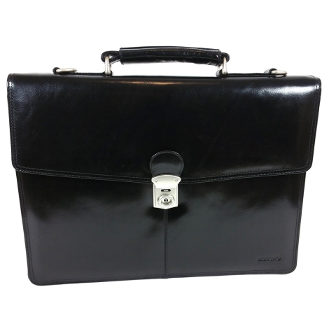 Rialto márkájú, klasszikusan elegáns, igényes kivitelű és alapanyagú fekete férfi aktatáska. Nagyobb méretű, fekvő elrendezésű fazon, melyben nagyobb mennyiségű irat és személyes holmi, ...
