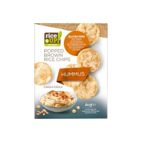 Rice Up barna rizs chips humusz ízű 60 g Teljes kiőrlésű barna rizsből készült chips hummus ízesítéssel. Vegán, gluténmentes, nem olajban sült. 50%-kal kevesebb zsírt tartalmaz, mint a burgonya alapú chipsek. Ez a chips legnagyobb részt teljes kiőrlé