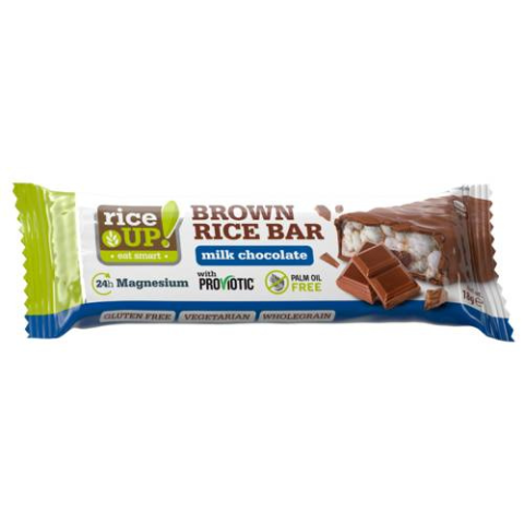 Rice Up szelet tejcsokoládé 18 g Rice Up puffasztott barna rizsszelet tejcsokoládé bevonattal. Összetevők: tejcsokoládé 68% (Belga) (kakaóvaj, cukor, teljes tejpor, kakaó massza, emulgeálószer: szójalecitin, természetes vanília aroma) teljes kiőrlésű