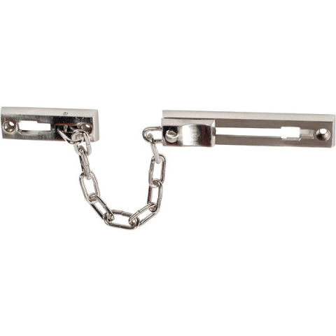 Biztonsági lánc - Ajtó, lehetővé teszi a a biztonságos ajtónyitást 15 cm-ig, anyaga: zamak, a csomag 4 db csavart tartalmaz. A biztonság növelésének érdekében, érdemes biztonsági láncot tenni a bejárati ajtóra. Ez a szerkezet megakadályozza, hogy egy kéretlen személy az ajtó túl oldaláról behatolhasson a laká