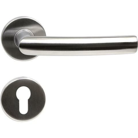 Ajtó vasalat - rozettás, kerek rozetta, kilincs - kilincs kivitel, beltéri, jobbos ajtóra, zár típusa PZ, anyaga rozsdamentes acél, matt felület, ezüst kivitel Rendeld meg tőlünk a népszerű Richter Czech márka kiváló minőségű RK.C-FORM.PZ.N ajtószerelvényét. A kilincs felülete rendkívül ellenálló és szilárd, még gyakori használat esetén is garantáltan h