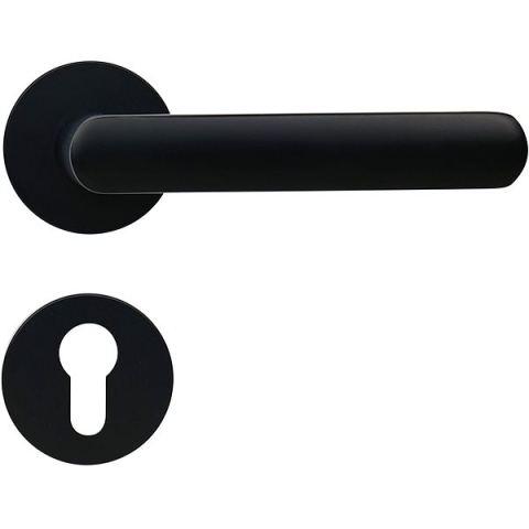 Ajtó vasalat - rozettás, kerek rozetta, kilincs - kilincs kivitel, beltéri, jobbos ajtóra, zár típusa PZ, anyaga alumínium, 32 - 58 mm vastagságú ajtókhoz, matt felület, fekete kivitel Kiváló minőségű fekete színű beltéri ajtó vasalatot keresel? Ha a válaszod igen, megtaláltad. A kerek rozettás alumínium vasalat kilincset visszahúzó rugós mechanizmussal ellátott, minőségi kivi