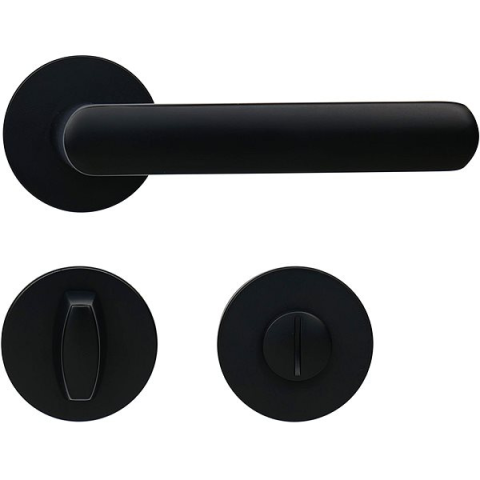 Ajtó vasalat - rozettás, kerek rozetta, kilincs - kilincs kivitel, beltéri, jobbos ajtóra, zár típusa WC, anyaga alumínium, 32 - 58 mm vastagságú ajtókhoz, matt felület, fekete kivitel Kiváló minőségű fekete színű beltéri vasalatot keresel a WC vagy a fürdőszoba ajtóra? Ha a válaszod igen, megtaláltad. A kerek rozettás alumínium vasalat kilincset visszahúzó rugós mechanizmussal