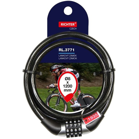 Kerékpár zár - sodrony, zárás kóddal, hossza 120 cm, elhelyezése vázra, tömege 170 g Védd kerékpárodat lopás ellen ezzel a megbízható, Richter Czech RL.3771.8x1200.CRN füst-fekete színű, kiváló minőségű és gyönyörű kivitelezésű lakattal. A kerékpárlakat számzáras kombinációval működik