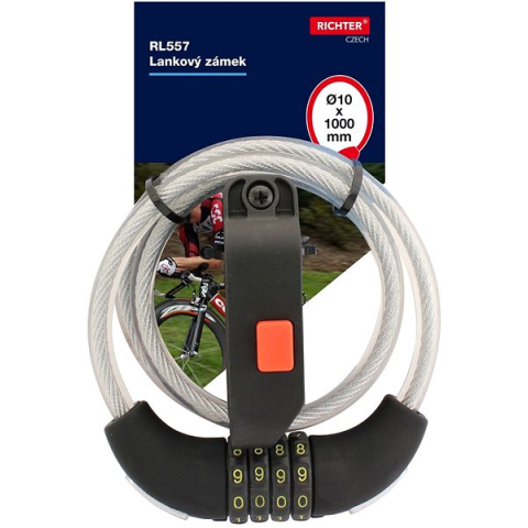 Kerékpár zár - sodrony, zárás kóddal, hossza 1000 mm, elhelyezése vázra, tömege 340 g Védd kerékpárod a lopás ellen ezzel a megbízható Richter Czech RL.557.10x1000.CIR zárral, mely minőségi kivitelezéssel és szép designnal rendelkezik. A kerékpár zár numerikus kombináció elvén műk
