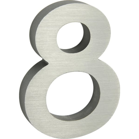 Házszám - alumínium, 3D kivitel, csiszolt felület, magassága 10 cm, szürke szín, ragasztószalag és szerelési anyag a csomag része A Richter Czech RN.100LV.8.AL.3D szám 3D-s csiszolt alumínium dizájnnal rendelkezik, illetve rozsdamentes acélból készült, sík, 2D kivitelben. A matt ezüst színének köszönhetően nagyon elegáns htású.