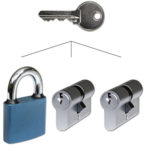 Azonos zárlatú szett - közös kulcsnyitással- "SU" 1 db lakatot (RV.OVAL.52) és 2 db henger zárbetétet (EO.30/35.NI) tartalmaz.