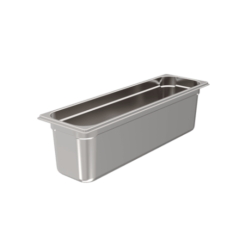 Gasztroedények praktikus egymásra rakható markolattal (külső oldalon mind a négy sarokban), 1/1, 2/3, 1/2, 1/3 GN méretben és 55, 65, 100, 200 mm mélységben kaphatók.