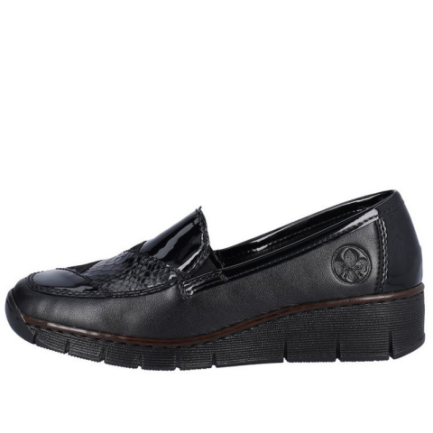 Rieker 53785 00 bebújós női félcipő Belső talphossz: EU 38 39 40 41 42 CM 25 25,5 26 26,5 27 Kényelmes, divatos, bebújós, női félcipő.Modell: Rieker 53785 00Szín: black / feketeFelsőrész: természetes bőr - szintetikus soft nappaBél