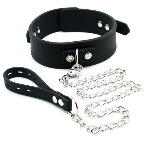 Elegáns nyakörv, tartós, enyhén rugalmas szilikon gumi anyagból, hozzá tartozó gyorsoldós láncpórázzal, melynek csuklóakasztója szintén szilikon gumiból készül. A nyakörv teljes hossza: 47 cm Szélessége: 4,5 cm 37 - 51 cm közötti nyak-kerületre ideál