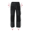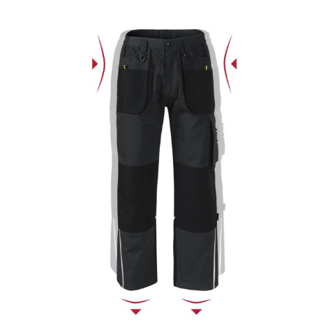 Szövött anyag, 65 % poliészter, 35 % pamut, 270 g/m²; 100 % poliamid, 210 g/m² övrész elasztikus oldalakkal10 muntifunkcionális zsebmegerősített anyag a térdeknél műanyag D-gyűrű és karabiner kulcsoknak és kártyáknakkalapács hurokduplavarrás az extra t