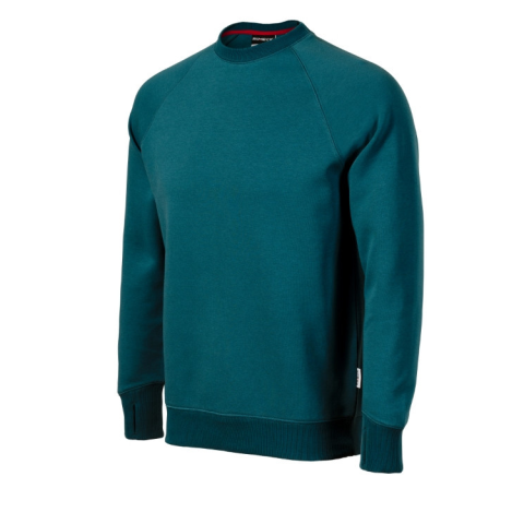 Kétoldalas interlock kötés, 80 % pamut, 20 % poliészter egyenes szabás oldalvarrással belső nyakkivágás hátul kontrasztos szalaggal megerősítve raglán ujjak duplavarrással 2:2 bordás kötésű szegély, nyakkivágás és mandzsetták 5 % elasztánnal mandzsettá
