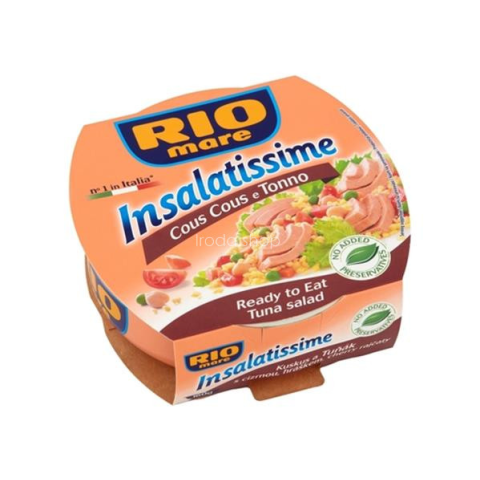 Tonhalsaláta, 160 g, RIO MARE Insalatissime, kuszkuszos Zöldséges készétel kuszkusszal és tonhallal. Összetevők: Tonhal 23%, kuszkusz 35% (durum búzadara) só, kukoricaolaj, csicseriborsó 6%, sárgarépa 5%, borsó 5%, paprika, koktél paradicsom 3%, vörös