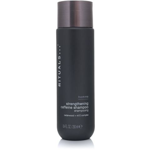 Sampon - hagyományos sampon, minden hajtípusra ajánlott, növekedést serkentő és tápláló hatás, 250 ml-es kiszerelésben, luxus kozmetikum A RITUALS Homme Strengthening Caffeine Shampoo összetétele és fűszeres, egzotikus fás illata révén kifejezetten férfiak számára készült. Támogatja a haj és a fejbőr egészségét, erősíti a hajszálakat é