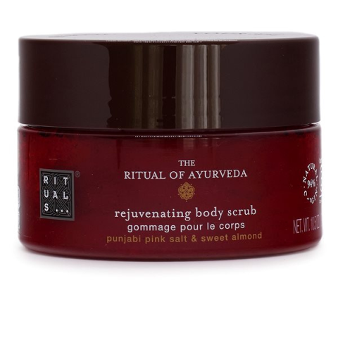 Testradír - női, zsíros, normál, kombinált, száraz és érett bőrtípusra, főbb hatóanyagai kókuszolaj és mandulaolaj, tömege 300 g A Rituals The Ritual of Ayurveda testradír fiatalító testápolást kínál és 94%-ban természetes összetevőkből áll. Olajok keverékét és pandzsábi rózsaszín sót tartalmaz. Ezt a kősót Pandzsábban bányássz