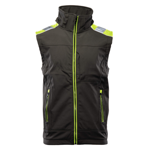Modern és sportos megjelenésű, egyenes szabású softshell anyagú munkásmellény fekete-sárga színösszeállításban.A mellény kapucnija lecipzározható, továbbá praktikus fényvisszaverő elemek segítik a láthatóságot. Egyenes szabású, levehető kapucnis softs