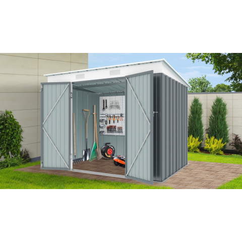 Anyag/szín: fém, antracit Mértek (H/Sz/M): 183 x 240 x 180 cm Alapterület méretei: 176 x 234 cm Ajtó mérete (M/Sz): 158 x 114 cm Ajtó: dupla, szárnyas- Tárolási térfogat: 6,6 m3 Korrózió elleni védelem: tűzihorganyzás Szín/festék: porfestett Acéllemezek vastagsága: 0,25 mm Acélkeret vastagsága: 0,6 mm Merevített tető: igen Merevített oldalfalak: igen Ajtózár: igen Súly: kb. 63 kg