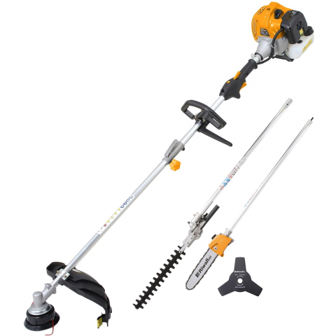 Sokoldalú segítő, amelyet trimmerként, bozótvágóként, sövényvágóként és metsző lánc felső motorként lehet használni, kiváló minőségű szűrő, alacsony kibocsátású, kb. 2,0 LE maximális teljesítmény Könnyű, alacsony feszültséggel ahhoz, hogy fűrészel vagy sövényvágóval dolgozzon. Automatikus lecsévélés és a húrhossz beállítása a talaj könnyű löketével Osztott tengely az egyszerű szállításhoz Kényelmes pánt alapfelszereltségként.