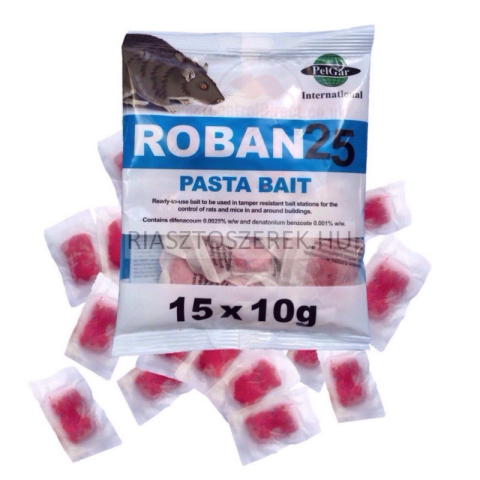 Roban Rágcsálóirtó pép 150g. Azonnal használható, kimagasló hatékonyságú egér és patkányirtó pép. Rágcsálót látott? Oldja meg a problémát azonnal rágcsálóirtó péppel! A Roban 25 Pasta Bait egy használatra kész csali, amely kiváló minőségű. Étkezési minősé
