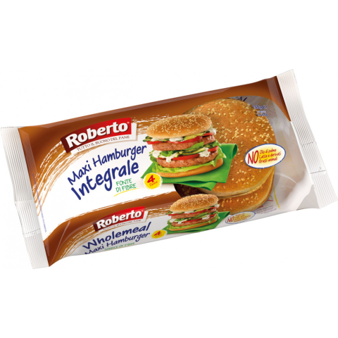 Roberto teljes kiőrlésű maxi hamburger 300 g Hamburgerzsemle teljes kiőrlésű búzaliszttel, szezámmaggal és napraforgóolajjal. Összetevők: Teljes kiőrlésű búzaliszt (35,0%); Ivóvíz; Búzaliszt (29%); Glükóz-fruktóz szirup; Élesztő; Szezámmag (2,8%); Cuko