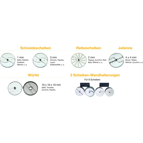 illeszkedik a R502 V.V. és a CL 50 Ultra - 1 V modellhez Változat: Vágótárcsák 1 mm + 3 mm, Reszelőtárcsák 2 mm, Julienne 4x4 mm, Kockák 10 x 10 x 10 mm, Falikonzol, Vágótárcsák 2 mm + 5 mm, Reszelőtárcsák 2 mm + 5 mm, Hullámos tárcsa 3 mm, Julienne 2 x 2 mm, Kockák 10 x 10 x 10 mm Anyag: Fém