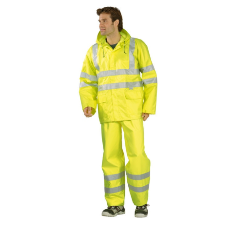 Eső elleni, jólláthatósági munkavédelmi dzseki, sárga Tulajdonságok: Alapanyag: 100% poliészter, 3M reflexcsíkkal ellátva Sárga színű Kapucnis Állítható csukló- és derékrész 2 elülső zseb, 1 belső zseb 3M jól láthatósági csíkkal Patentos zsebfe