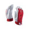 Törtfehér kecske színbőr kesztyű vörös kézháttalTörtfehér kecske színbőr tenyérKöröm- és érvédőPiros pamutkézhátTépőzáras csuklórész