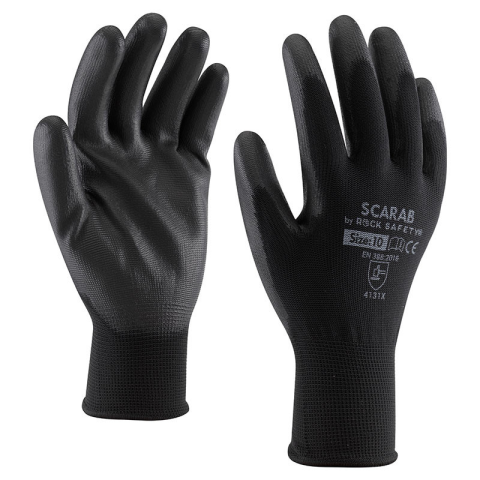 Poliészter szerelőkesztyű PU tenyérmártással Termékleírás: Alapanyag: poliészter Tűfinomság: 13 Fekete PU tenyérmártás Kiadóautomatához hajtogatott változat: SCARAB = PN8003 EN 388:2016 (4131X) Használati útmutató: Védő, munka kesztyű Munk