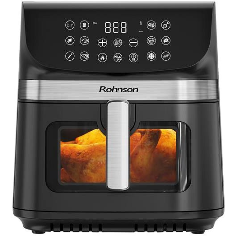 Airfryer - digitális vezérlés, 80 - 200 °C között szabályozható hőmérséklet, tapadásmentes felület, kijelző, túlmelegedés elleni védelem, fedél nyílással, mosogatógépben mosható részek, belső világítás, időzítő, automatikus kikapcsolás, hőmérséklet szabályozás és automatikus programok, 12 program, kivehető edény, 1800 W teljesítmény, 9 l-es edény tapadásmentes felülettel, 1 fritőz kosár, tömege 5,2 kg, méretei 34 × 32 × 40,7 cm (ma × szé × m