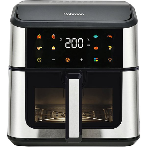 Airfryer - digitális vezérlés, 80 - 200 °C között szabályozható hőmérséklet, tapadásmentes felület, teflon, kijelző, túlmelegedés elleni védelem, termosztát, fedél nyílással, belső világítás, időzítő, automatikus kikapcsolás, hőmérséklet szabályozás és automatikus programok, 8 program, kivehető edény, 1500 W teljesítmény, rozsdamentes edény tapadásmentes felülettel, 1 fritőz kosár, tömege 5 kg, méretei 31,5 × 30,3 × 38 cm (ma × szé × mé), feket