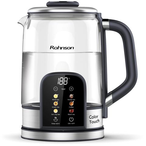Vízforraló - hőmérséklet szabályozás, űrtartalma 1,7 l, fekete és ezüst kivitel, 2200 W energiafogyasztás, érintéses vezérlés, szűrő, LCD kijelző, LED világítás, forgótalp, rejtett spirál és kábeltartó rekesz, automatikus kikapcsolás, túlmelegedés és víz nélküli működés elleni védelem, hangjelzés, hőmérséklet megtartása, vízszint jelző, figyelmeztetés forráspont elérésekor, kihajtható szűrő, anyaga üveg Eme 1,7 lűrtartalommal rendelkező Rohns