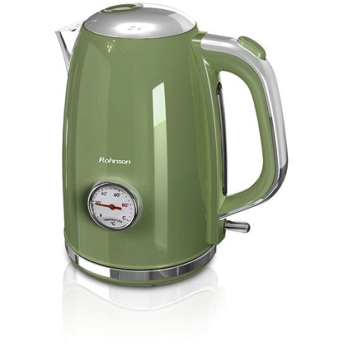Vízforraló - retro dizájn, rozsdamentes, űrtartalma 1,7 l, zöld kivitel, 2200 W energiafogyasztás, bemeneti feszültség 230 V, forgótalp, háttérvilágítású kapcsoló, rejtett spirál és kábeltartó rekesz, automatikus kikapcsolás, működésjelző lámpa, túlmelegedés és víz nélküli működés elleni védelem, vízhőmérséklet jelző Eme 1,7 lűrtartalommal rendelkező Rohnson Vízforraló biztosítja a tea vagy kávé egyszerű és gyors elkészítését. A vízforralót