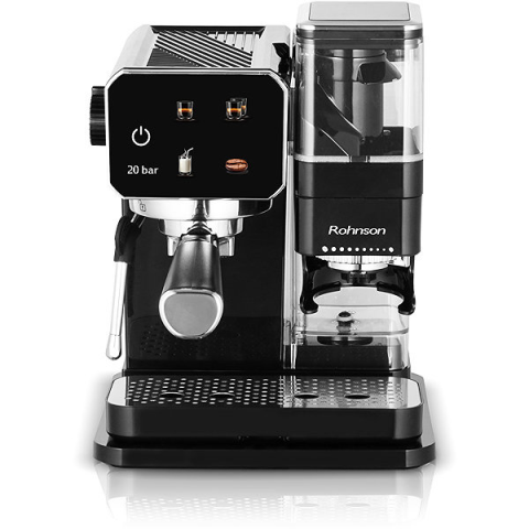 Karos kávéfőző - otthonra, 1350 W teljesítmény, 20 bar nyomás, anyaga műanyag, 0,9 l-es víztartály, forró víz funkció, két csésze készítése egyszerre, italkészítés egy gombnyomásra, víztartály, kávédaráló, gőzfúvóka, tárolóhely a poharaknak és csészemelegítés, érintős vezérlőpanel ikonokkal, állítható kávé intenzitás/mennyiség, italméret, mérete 30 × 21,5 × 22,7 cm (Ma×Sz×Mé), tömege 4,1 kg A szuper Rohnson darálós karos kávéfőző seg