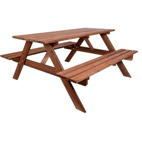 Kerti bútor - kerti bútor szett, barna színű, padok száma: 2, terhelhetősége 200 kg, asztal formája: téglalap, mérete: 180 cm × 145 cm × 75 cm, szett anyaga fa, fa fajtája fenyő, ülés anyaga fa A ROJAPLAST kerti piknik összeállítás minőségi fenyőfából készült. A fát gyönyörű gesztenye színűre lakkozták. A színes bevonat nagyszerűen véd a külső hatásokkal szemben, így a szettet nem